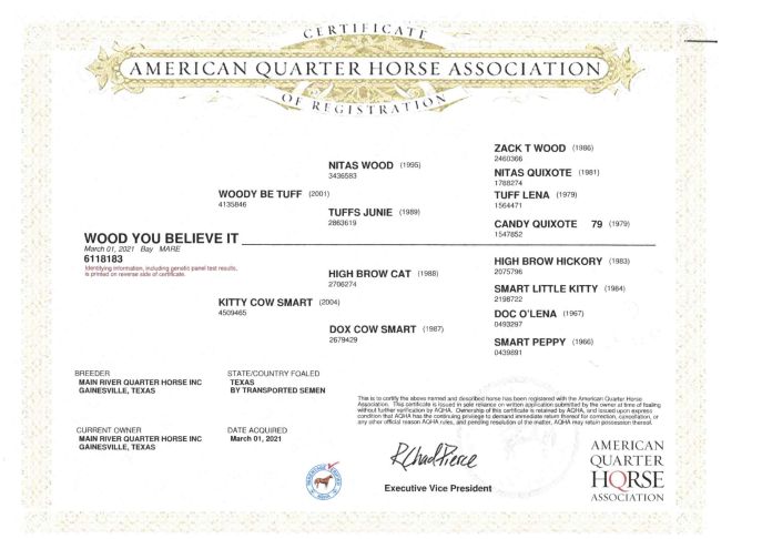 Dam: Kitty Cow Smart, money winning daughter of High Brow Cat out of Dox Cow Smart, full sister to Smart Little Lena.