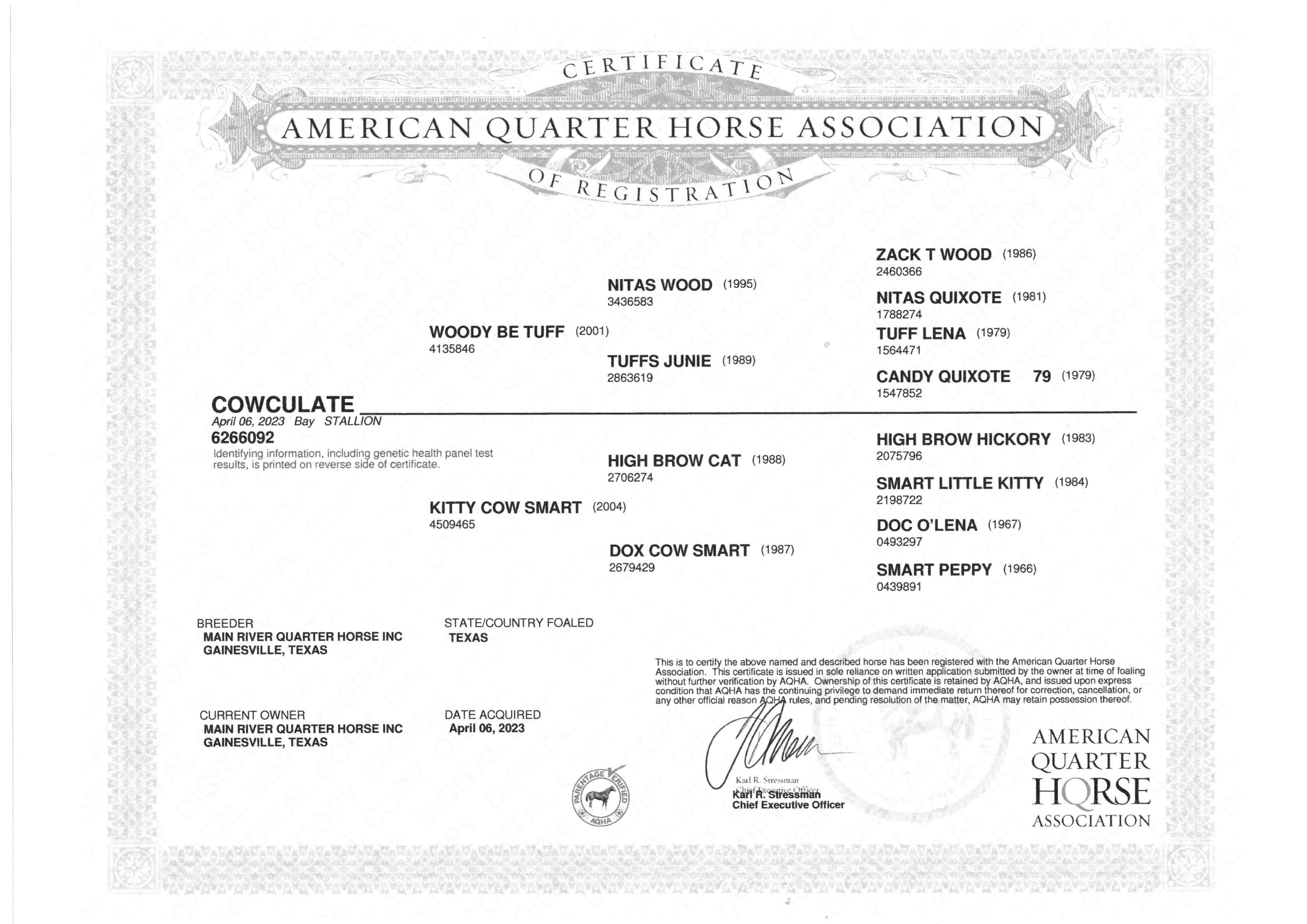 Sire: Smooth as a Cat. Life-Time-Earning over 500,000 $. NCHA Horse of the year.
