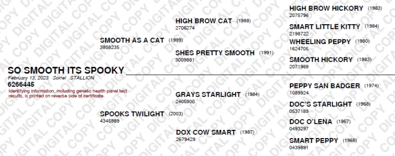 Dam: Spooks Twilight, a daughter of Grays Starlight out of a full sister to Smart Little Lena.