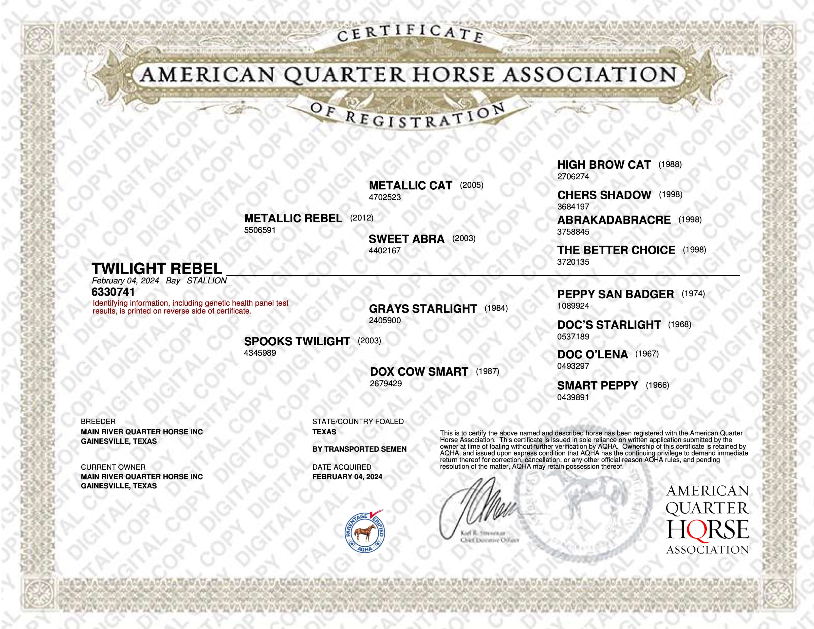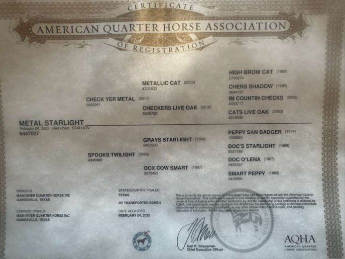 Sire: Metallic Rebel. Life-Time-Earning 410,686 $. NCHA Horse of the year.